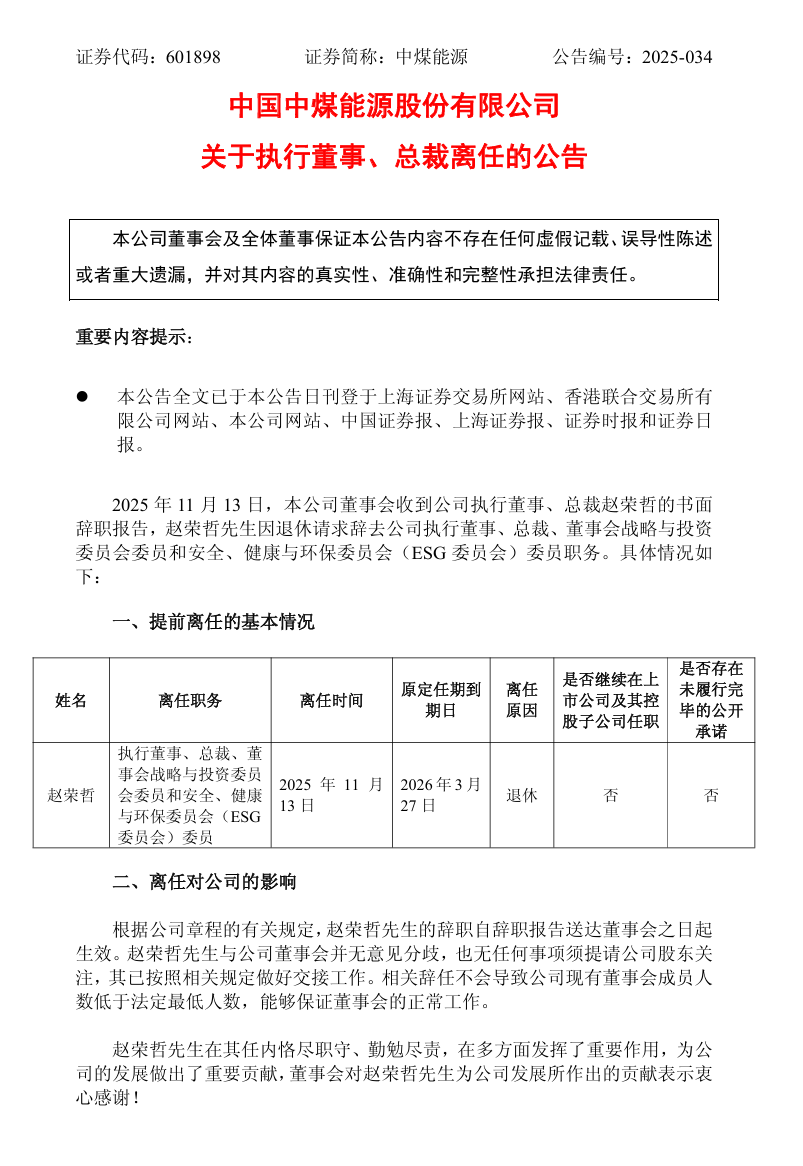 11月14日,中煤能源发布公告称,11月13日正规配资平台app,公司董事会收到公司执行董事、总裁赵荣哲的书面辞职报告,赵荣哲先生因退休请求辞去公司执行董事、总裁、董事会战略与投资委员会委员和安全、健康与环保委员会(ESG委员会)委员职务。