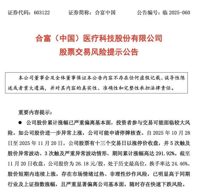 11月20日,合富中国复牌后再度涨停,创出历史新高。停牌前,该公司股价在14个交易日录得12个涨停板。10月28日~11月20日期间,该公司股价累计上涨291.92%。
