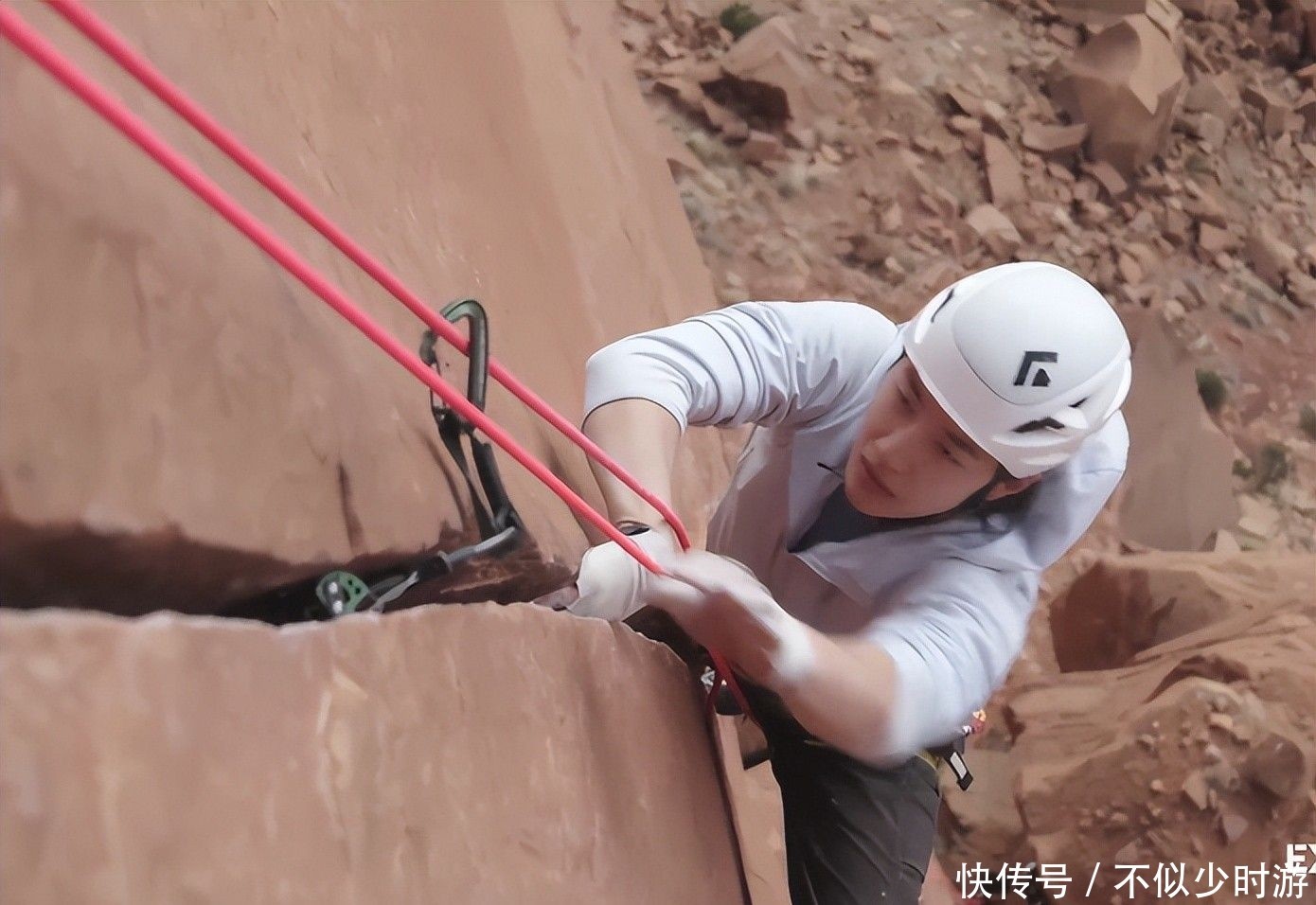 13. 片中最惊心动魄的一幕发生在一次高空攀爬过程中:王一博因脚底打滑瞬间失去平衡,整个人倒悬空中,脚下便是深不见底的断崖。